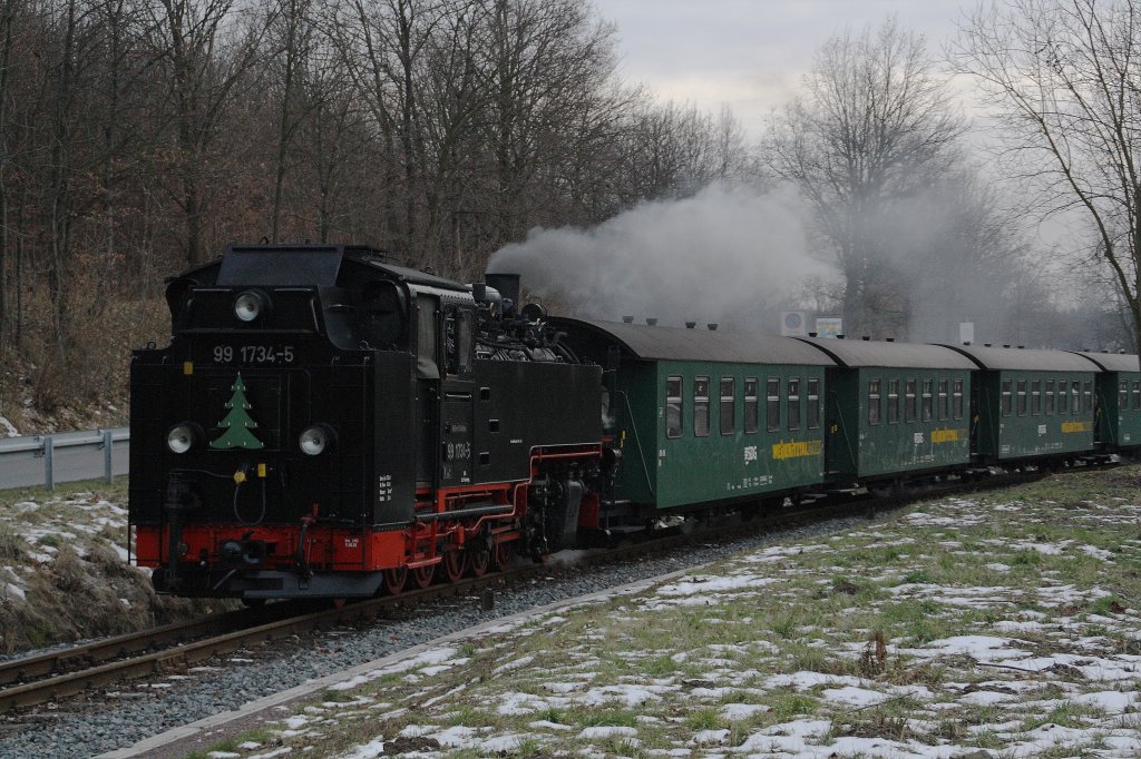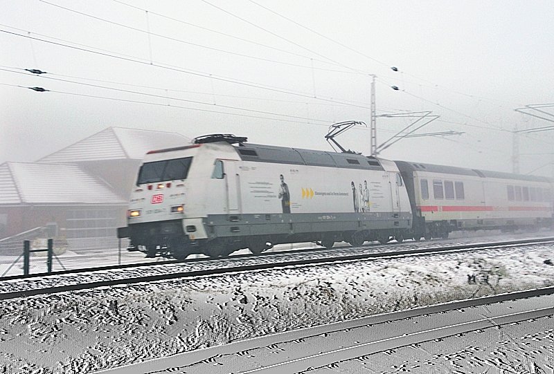 Am 08.01.10 ist noch wenig Schnee an der Strecke Cottbus - Leipzig doch die alten BÜ's bremsen den Zug bei Temperaturen um 0'C durch Störungen an den Schaltrelais oft aus. So muss er auch hier vorher noch einmal halten und sammelt so Verspätung ein.