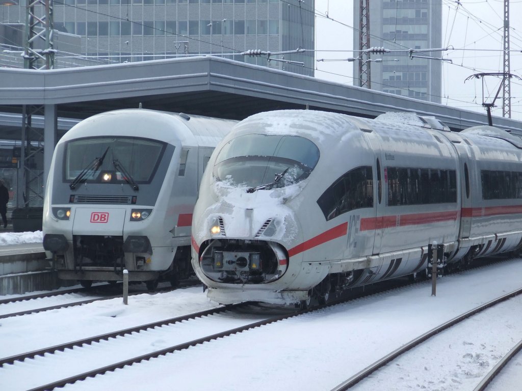Am 03.01.2010 schiebt sich ein IC Wendezug langsam hinter einem wartenden ICE 3 im Essener Hbf vorbei.