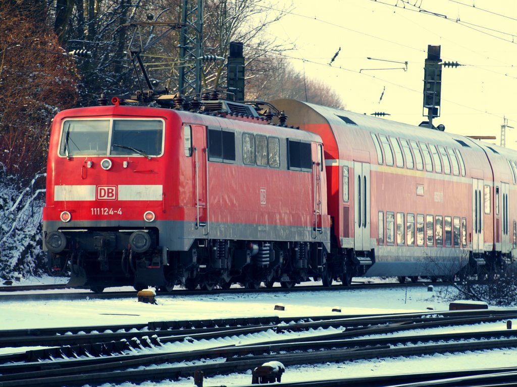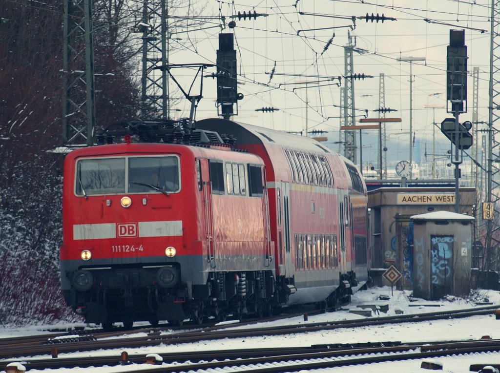 Am 06.01.2010 zieht 111 124-4 um 12.38 Uhr den RE4 (Wupper-Express) aus dem Bahnhof Aachen West Richtung Aachen Hbf.