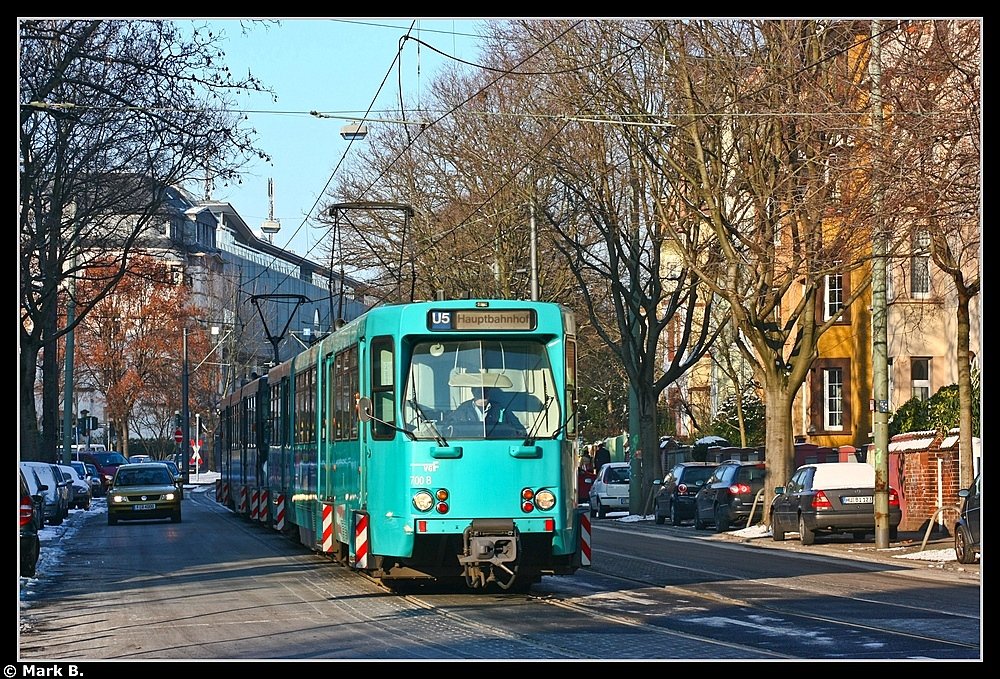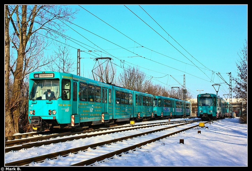 Ausfahrt Endstelle Preungesheim. Kreuzung zweier Ptb-Züge auf der Linie U5.