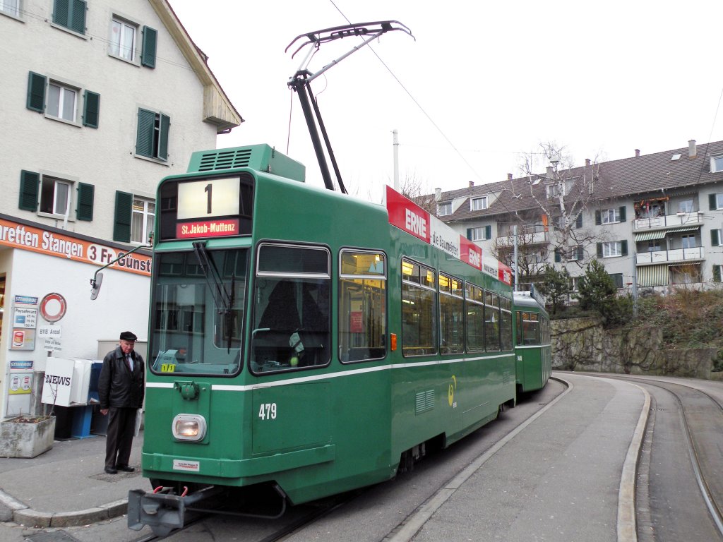 Be 4/4 mit der Betriebsnummer 479 an der Riehen Grenze. Die Aufnahme entstand wärend der Fasnacht 2009 wo die Linie 1 nach Riehen verlängert worden ist. Aufnahme vom 04.03.2009.