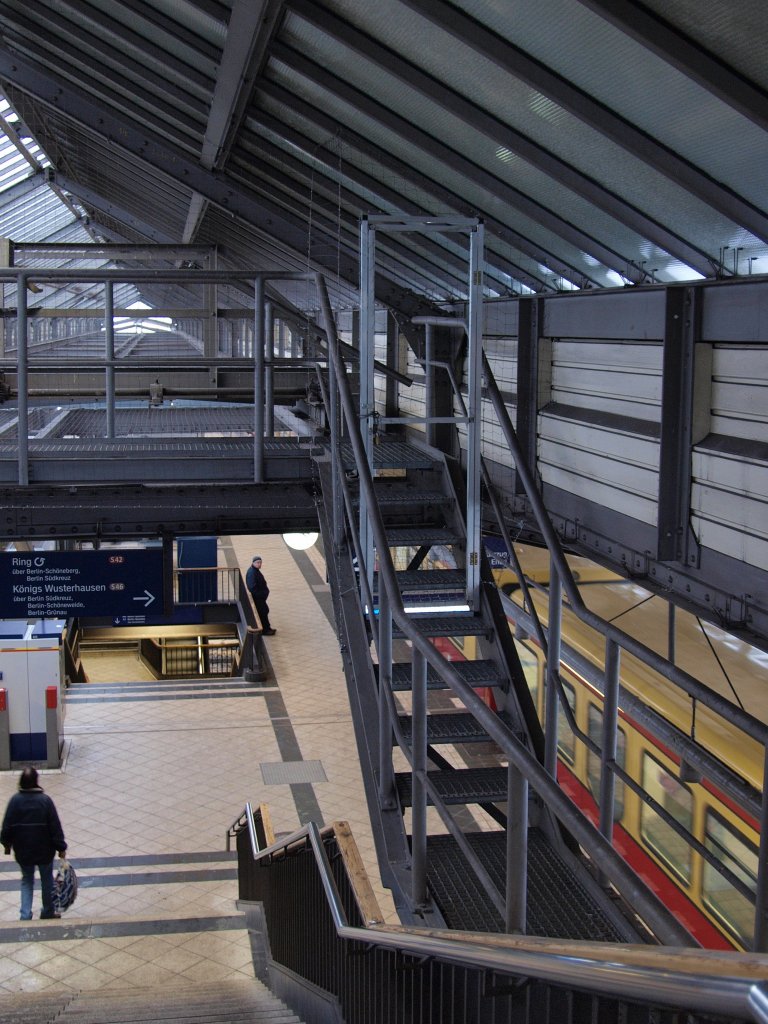 Blick in den Dachstuhl am Bhf. Westkreuz. Auf dem Bahnsteig ist eine S-Bahn der Linie S42 (Berliner Ring gegen Uhrzeigersinn) zu sehen. Aus dieser Perspektive hat man nicht nur den Durchblick durch den Dachstuhl, sondern auch zur Treppe, die zum unteren Bahnsteig führt (vgl. ID 111721 für ein Bild von unten). Die Dachscheiben sind mit Schnee bedeckt.