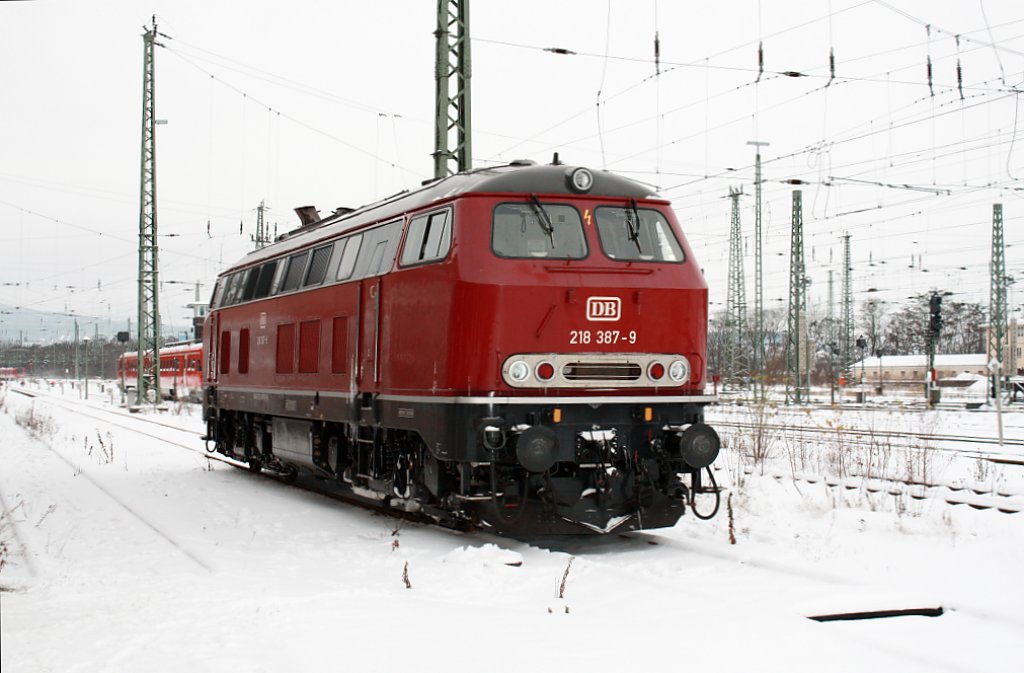 Die BR 218 387-9 steht im Kassler HBF und friert bei -3°