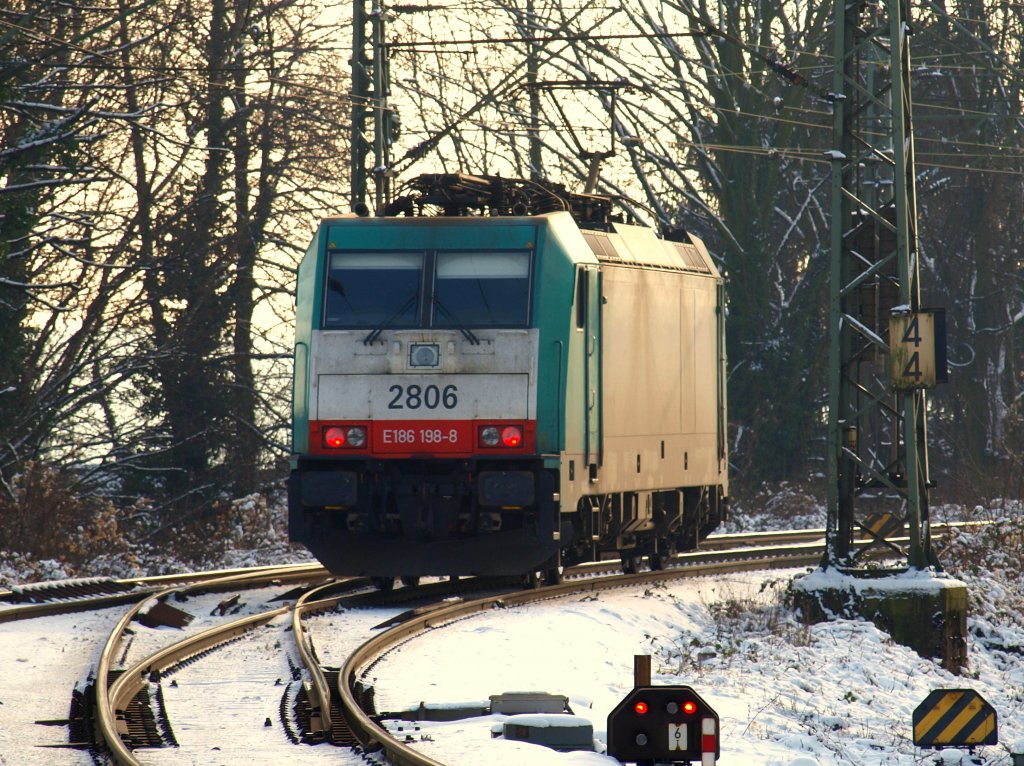 186 212 rangiert am 06.01.2010 bei schönsten Winterwetter in Aachen West. Die Lok koppelt gleich an den Güterzug links im Bild an, der nach Belgien gezogen wird.