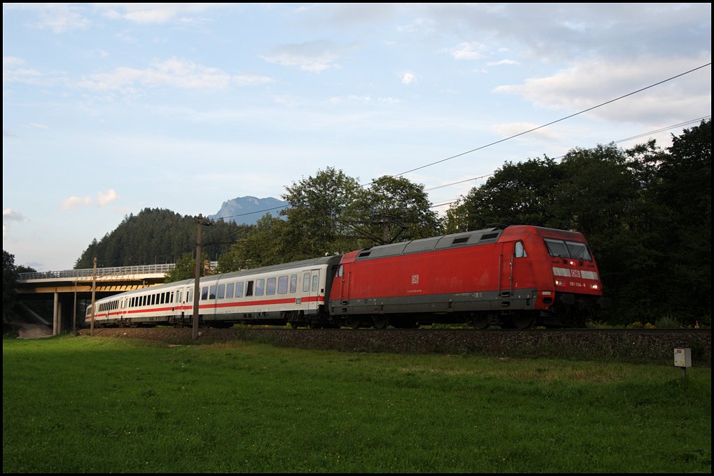 Du schon wieder;-) 101 104 (9180 6101 104-8 D-DB) schleppt den EC 189 von München nach Innsbruck Hbf. Aufgenommen am Abend des 09.8.2009 bei Kufstein.