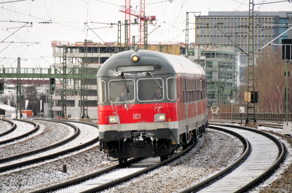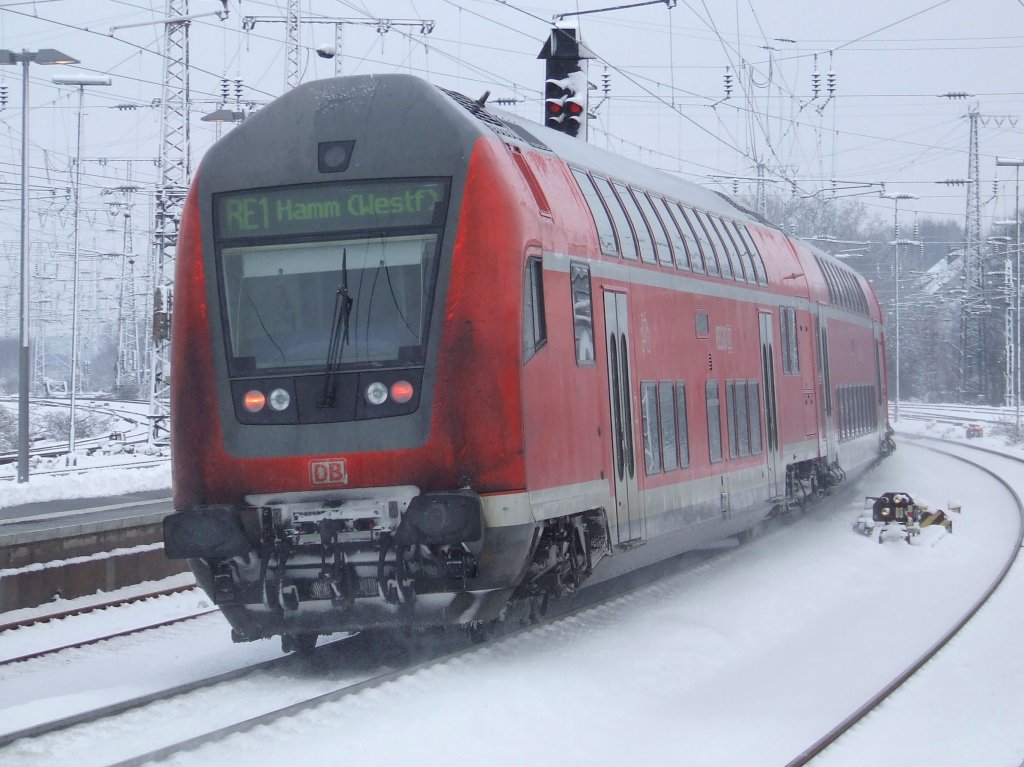 Ein Dostosteuerwagen verlässt am 03.01.2010 am Zugschluss eines RE 1 den Essener Hbf in Richtung Bochum.
