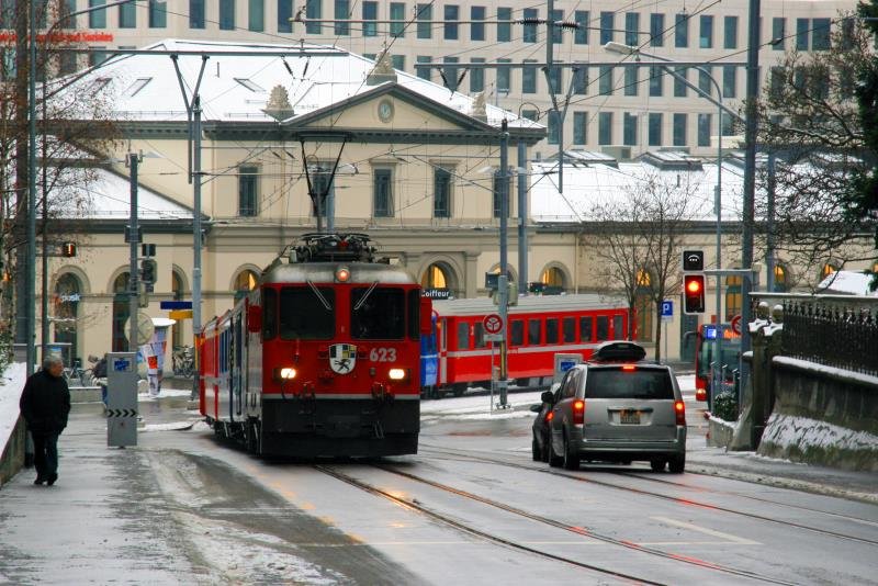 Ge 4/4II 623 in den Straßen von Chur; 09.01.2010