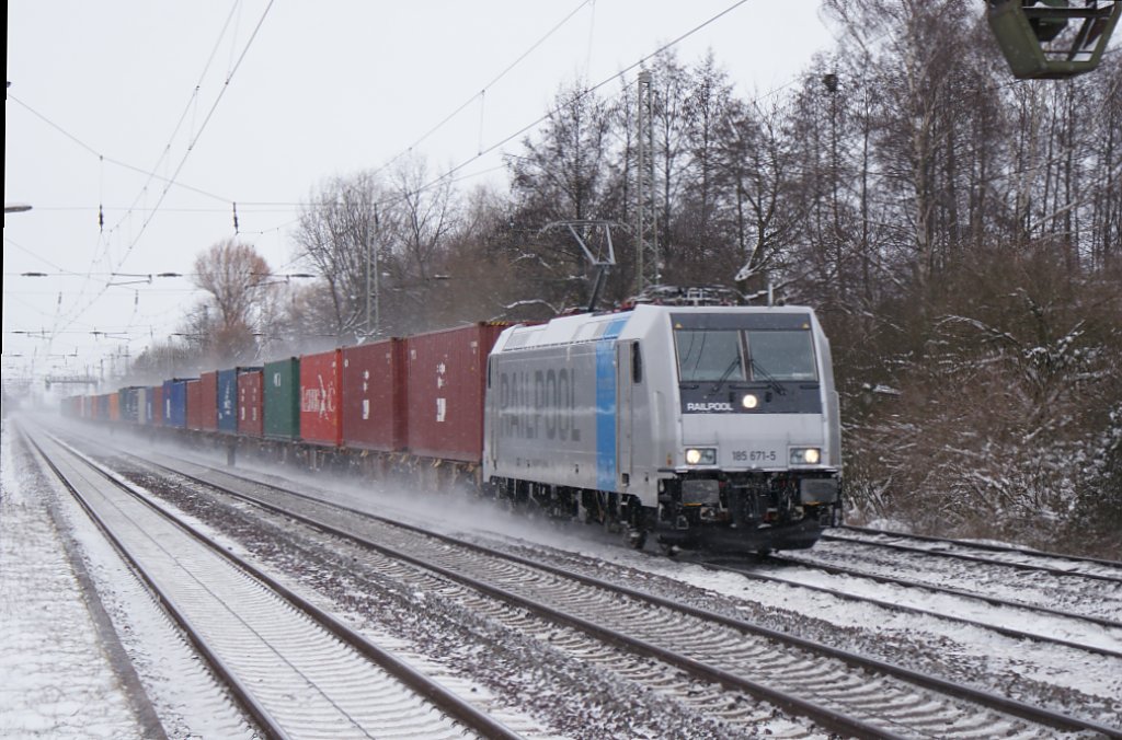 Heureka – meine erste RAILPOOL-185 kam! Die 185 671-5 die als Leihlok bei der EVB fährt,kam mit ihrem langen EVB-Containerzug am 09.01.2010 durch den S-Bahnhof Dedensen/Gümmer.