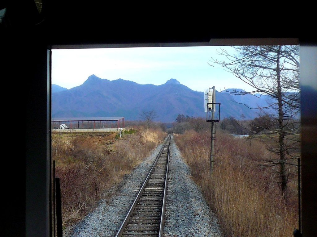Die Koumi-Linie der JR ist Japans höchstgelegene Bahnstrecke und erreicht 1345 m.ü.M. Sie ist 78,9 km lang, hat 31 Stationen, Steigungen von 33 Promille und führt von Kobuchizawa in der Präfektur Yamanashi steil hinauf ins Hochland von Nagano, wo sie in Komoro endet. Heute wird sie mit den Triebwagentypen KIHA 110/111/112 und den 3 Hybrid-Triebwagen KIHA E200 betrieben. Im Bild wartet vor der Kulisse des aktiven Vulkans Asama-yama die Komposition KIHA 112-111 + KIHA 111-111 in der Station Usuda. 24.November 2009.