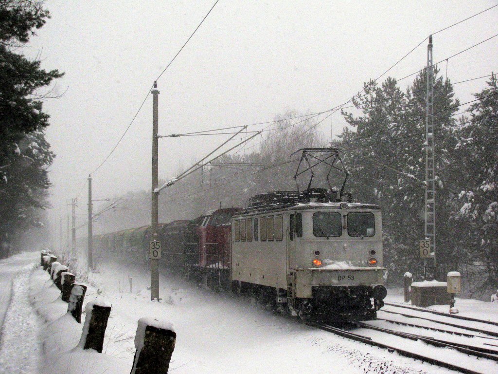 Und dank einer Meldung von Hannes Müller (Dank an dieser Stelle) konnte der Heute einzige auf der Strecke verkehrende Güterzug festgehalten werden. DP 53 mit einer Diesellok im Schlepptau und einem langen, langsamen Sägespanzug um 13:59 als DGS 59980 (Hoyerswerda - Niedergörne) Richtung Berlin.