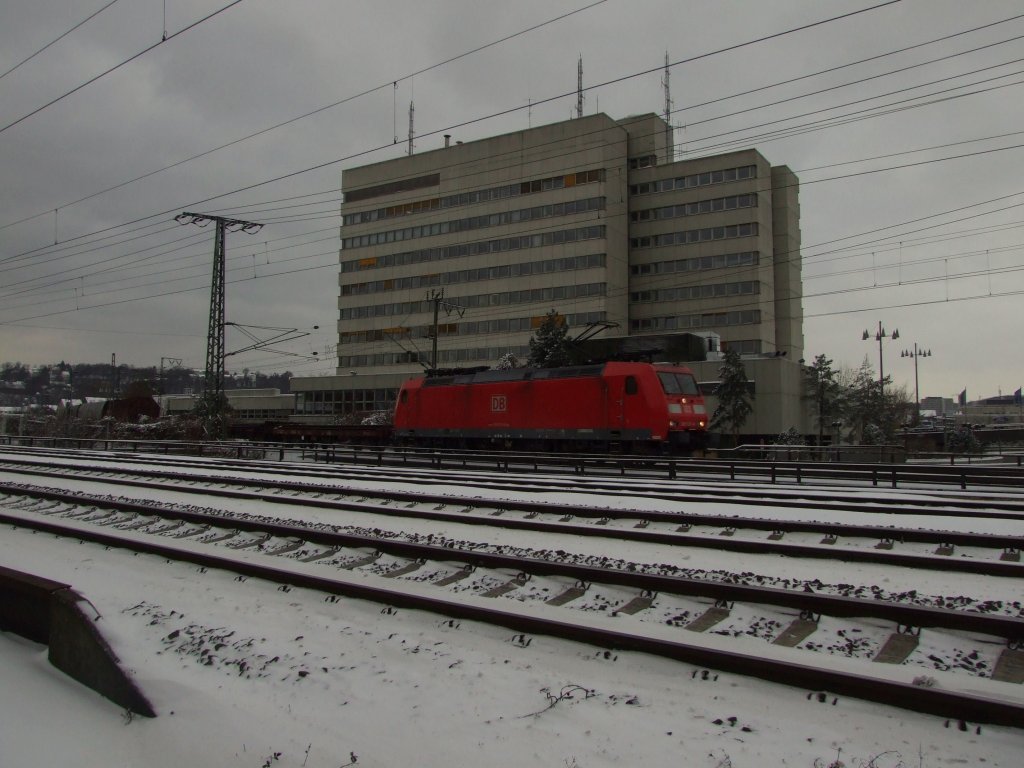 Zwischen Koblenz Hbf und Koblenz-Lützel konnte ich die 185 023-9 mit einem Güterzug von der Mosel kommend nach Norden ablichten.Das Gebäude im Hintergrund ist das Polizeipräsidium in Koblenz.9.1.2010