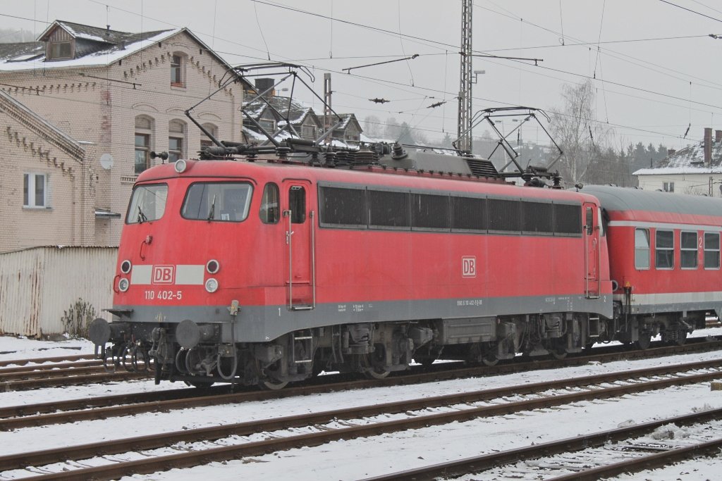 110 231-8 zieht einen Wahnsinnszug von einem IC Wagen durch Oelde in Richtung Hamm am 16.01.2010.