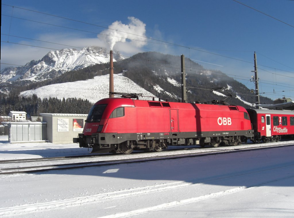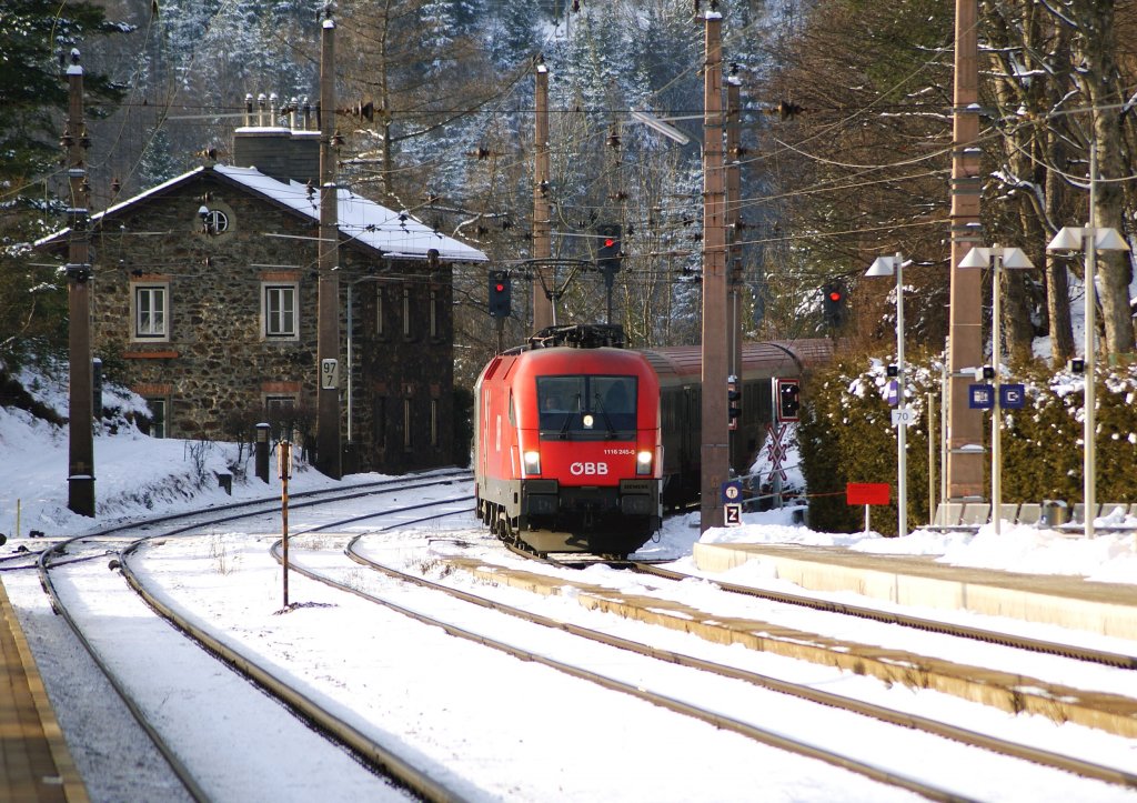 1116 136 verläßt soeben den Bahnhof von Hochfilzen. gelegen an der Strecke der "Gisela-Bahn" zwischen Saalfelden und Wörgl. Aufgenommen am 15. Januar 2010.