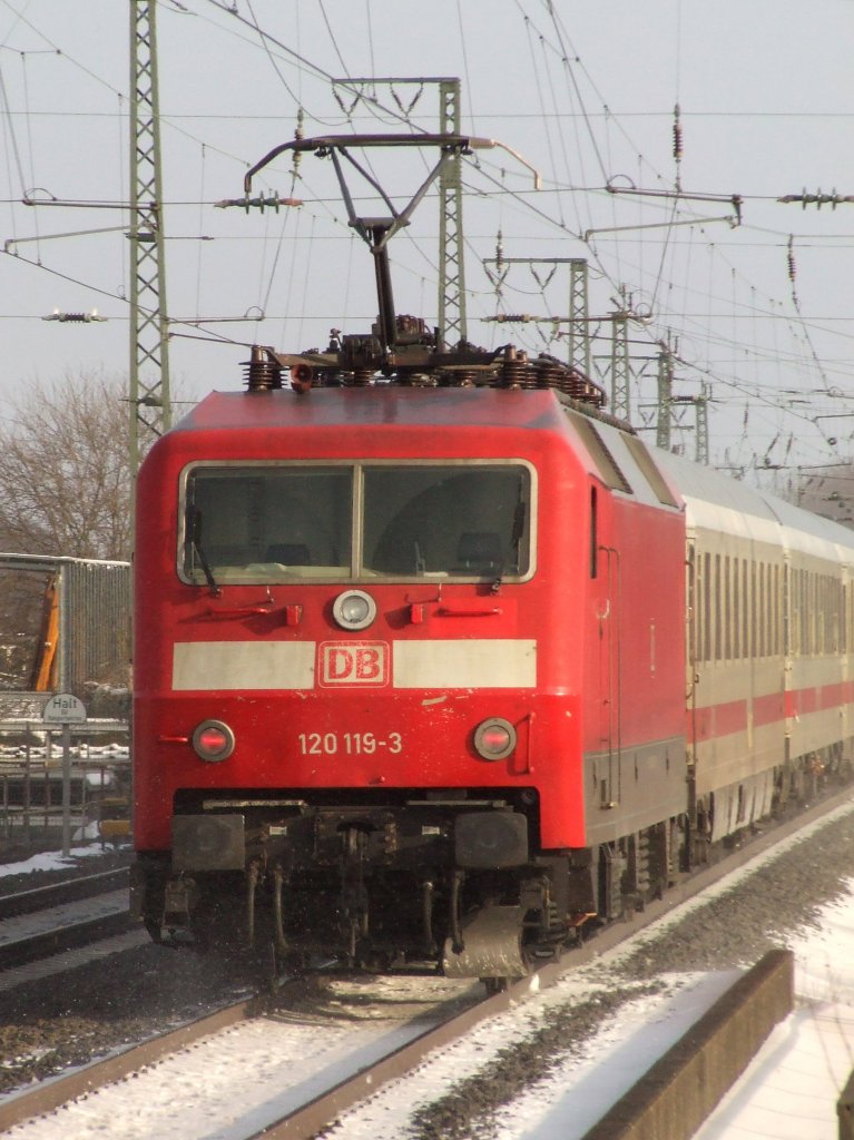 120 119 schiebt am 16.01.2010 einen IC gen Bielefeld durch Oelde.