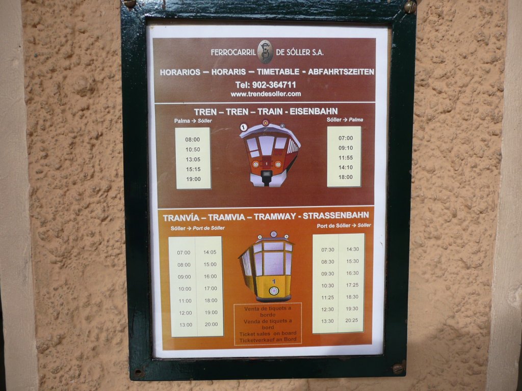 12.01.10,aktueller Fahrplan im Bahnhof Sóller für Tram und Zug,bis zum 1.Februar 2010 ist aber die Zugstrecke Sóller-Palma wegen Bauarbeiten gesperrt.