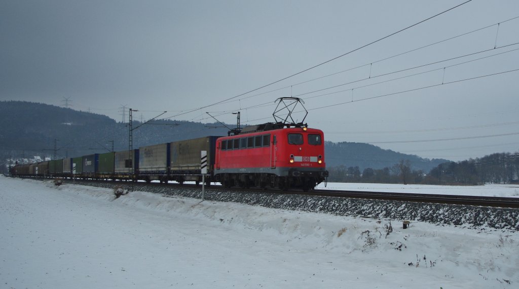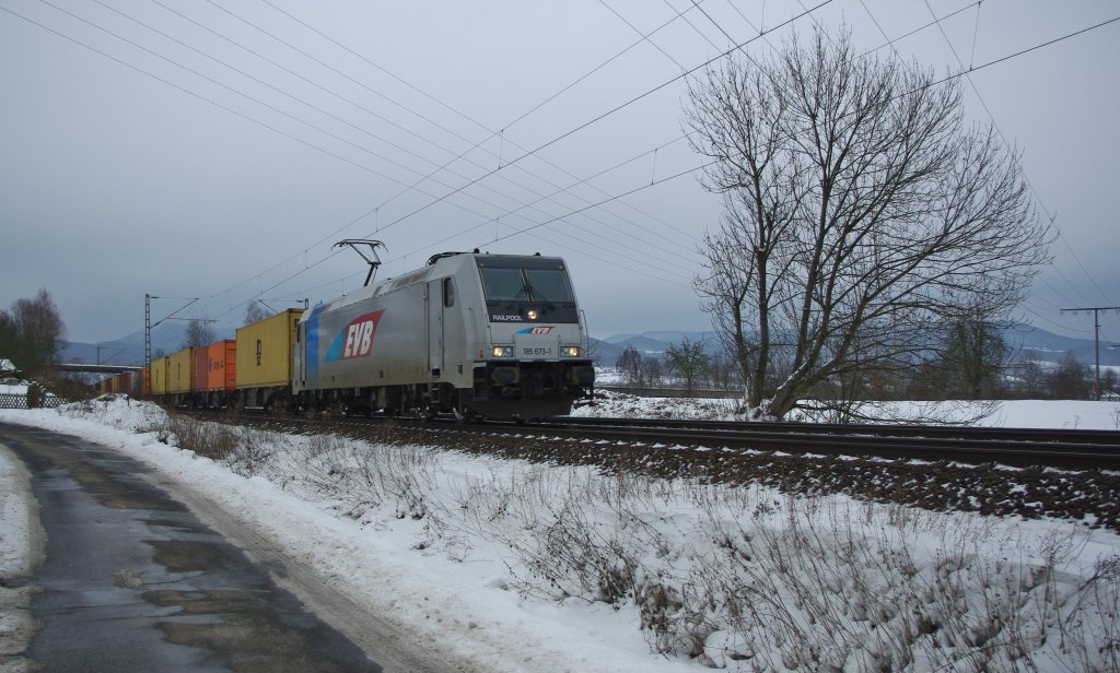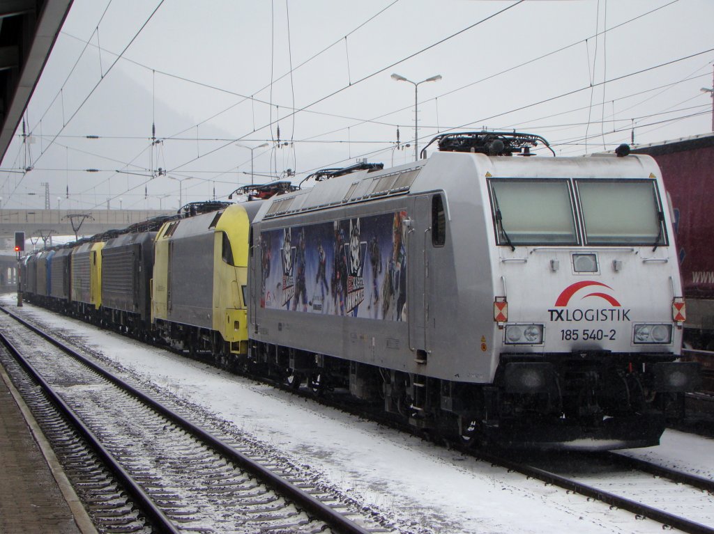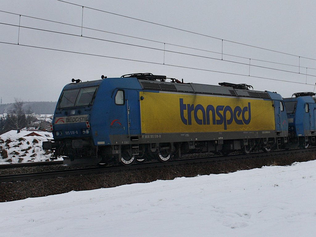 Die 185 518 von TXLogistik am 16.01.2010 am ende eines Lokzug der bei Ostermünchen unterwegs ist.