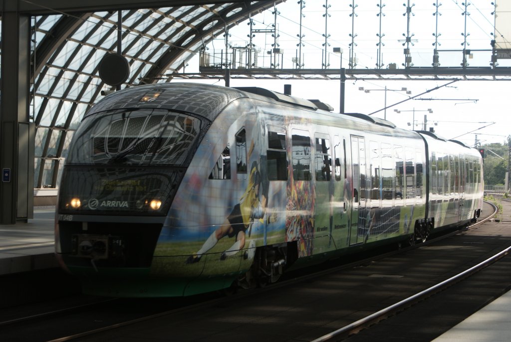Ein ET 428 FLIRT der Eurobahn verlässt am 16.01.2010 den Bahnhof Oelde in Richtung Hamm.