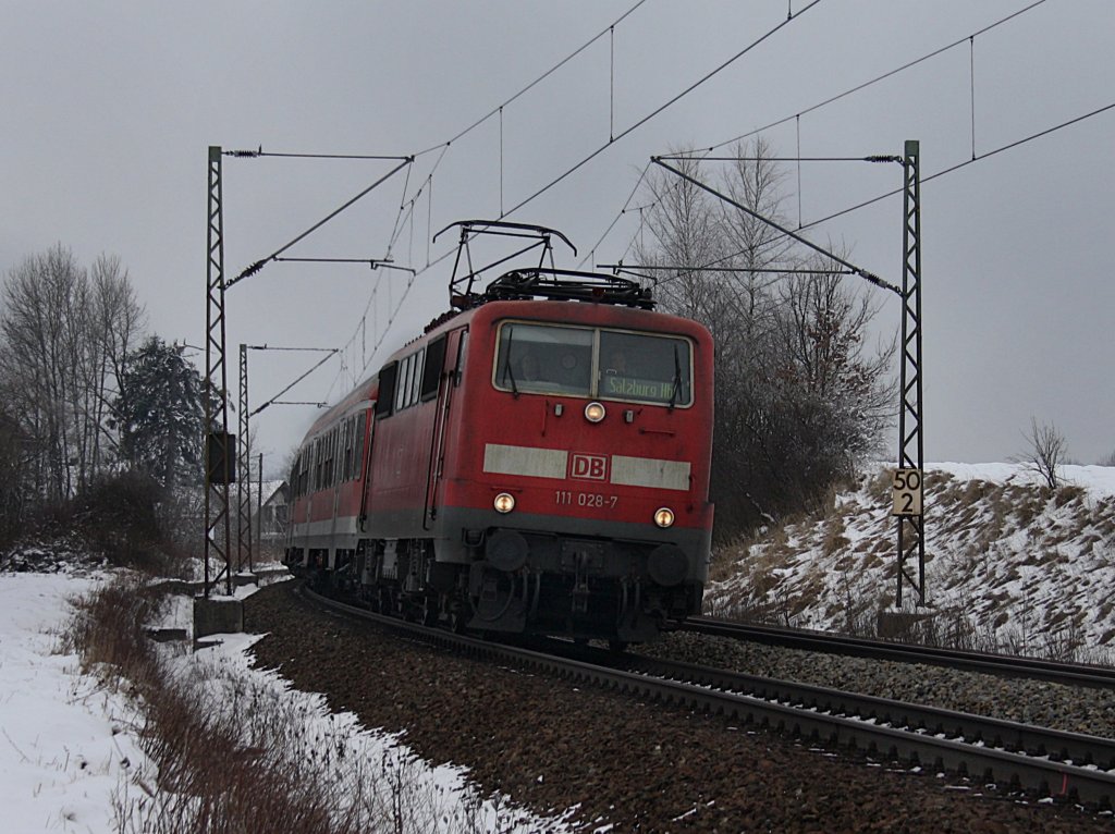 Die 111 028 am 16.01.2010 mit einem RE nach Salzburg unterwegs bei Ostermünchen.