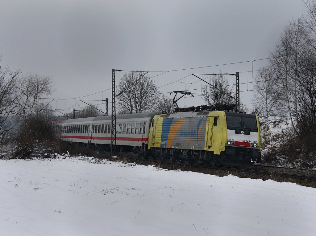 Die ES 64 F4-091 am 16.01.2010 mit einem Brenner EC unterwegs bei Ostermünchen.