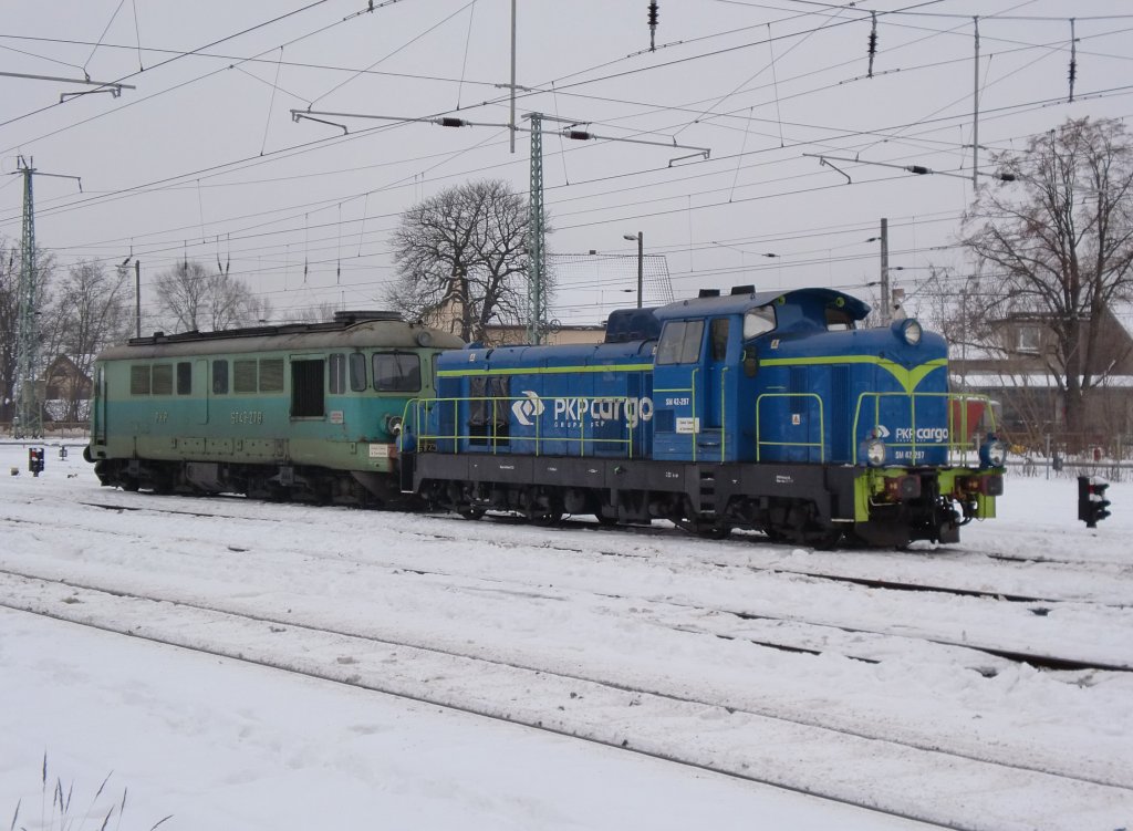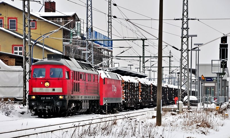 die gestrandete 152 019 mit ihrem Holzzug im Bf Greifswald bekommt Vorspann von 232 308 und kann so über Stralsund nach Rostock abgefahren werden, die Schneeverwehungen der letzten Tage waren geräumt, 13.01.2010