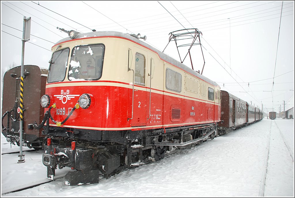 Die Nostalgie-1099 1099.14, die auch stolz das Nostalgie-Wappen trägt, brachte am 19. Dezember 2009 den leicht verspäteten R 6811 nach Mariazell. Wir stiegen in Kirchberg in den Zug zu und besichtigten den traumhaften Mariazeller Advent.