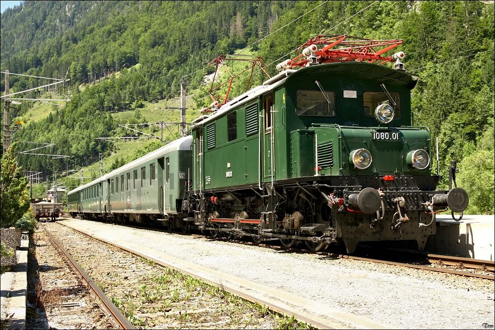 E-Lok 1080.01 fährt mit Sonderzug R 16412 von Hieflau nach Selzthal.Anlass für diese Fahrt war das Gesäusefest in Johnsbach. Hieflau 19.07.2008