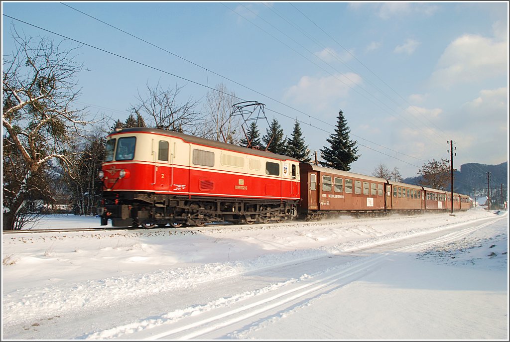 Am 12. Dezember 2009 bestand der Adventsonderzug nach Mariazell und zurück aus der 1099.002  Gösing , 5 Panoramic 760 Waggons und 2 zusätzlichen braunen Waggons. Ich konnte ihn zwischen Schwerbach und Loich ablichten.