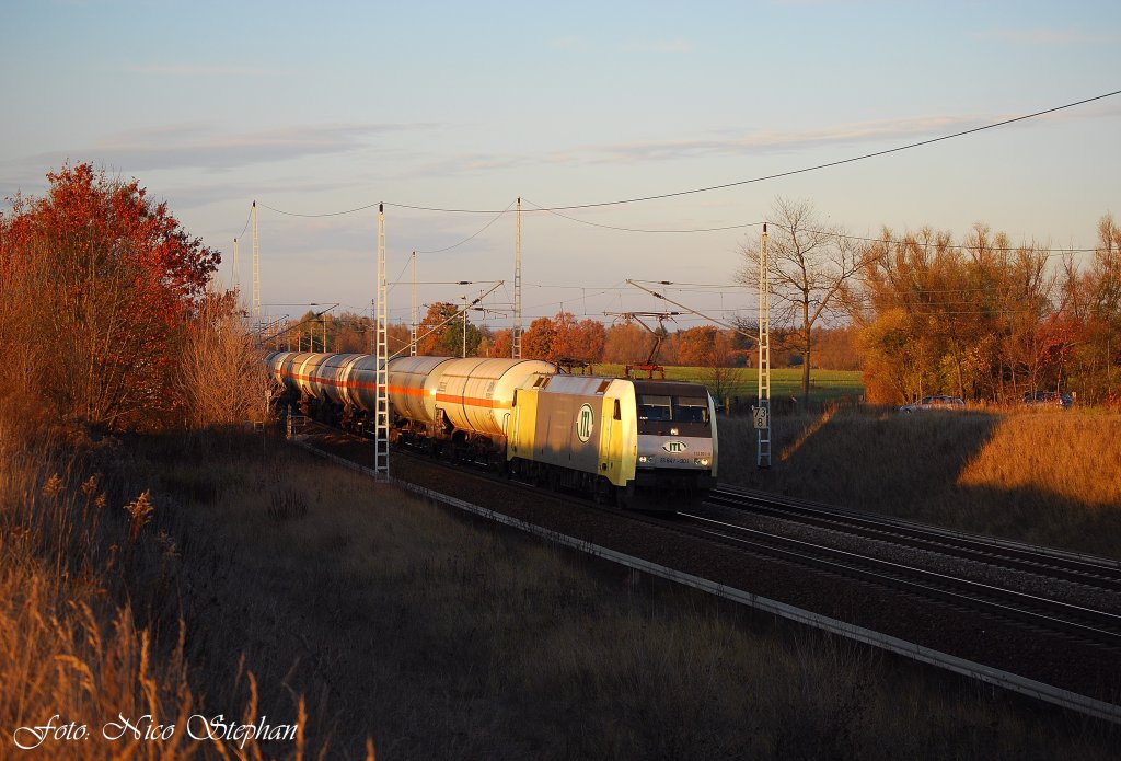 ITL 152 901-5 mit einem Kesselzug in den letzten Sonnenstrahlen des Tages am Bü 72 bei Priort Der Zug wurde aufgrund einer Baustelle über diesen Teil des Ringes umgeleitet,was sich kurze Zeit später noch lohnen sollte (07.11.09)