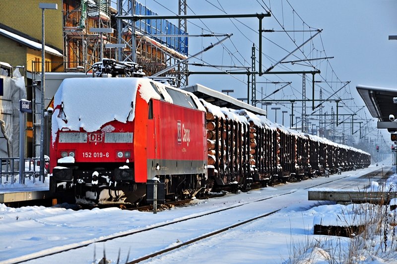 mit einer Hutkrempe voller Schnee war 152 019 mit ihrem Holzzug im Bf Greifswald abgestellt am 12.01.2010 weil weder in Richtung Pasewalk noch in Richtung Stralsund was ging - gut gehende Schneeverwehungen