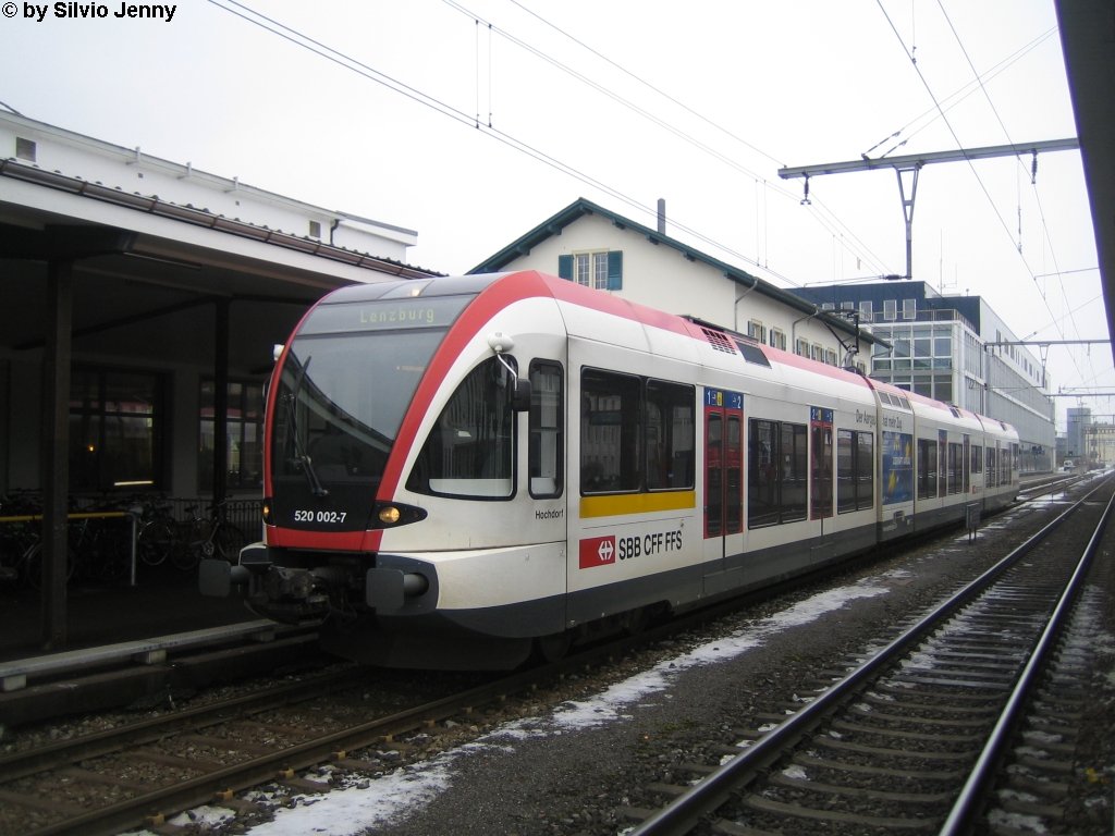 RABe 520 002-7 ''Hochdorf'' am 15.1.10 in Zofingen. Seit die Seetaler im Einsatz sind bedienen sie die S28 Zofingen - Lenzburg. Profilmässig könnte dort aber auch ein NPZ verkehren, was im Seetal nicht (mehr) der Fall ist.