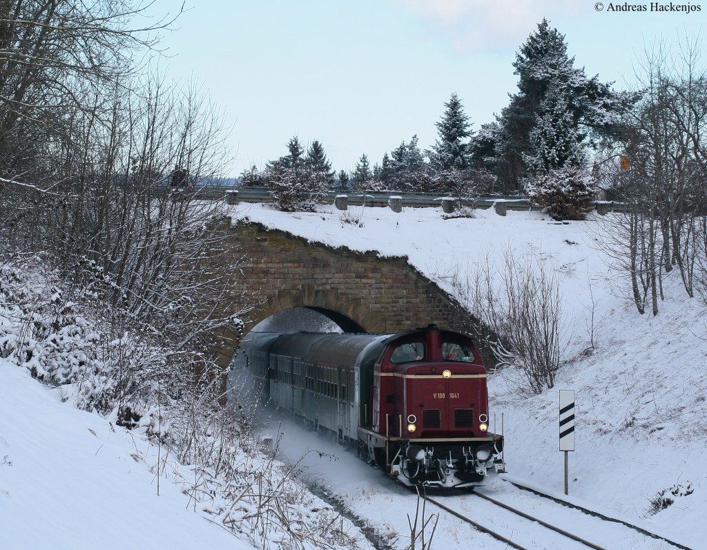 V100 1041 der Nesa und 78 468 (Zugschluss) mit dem DPE 37891 (Singen(Htw)–Seebrugg) bei Hüfingen 2.1.10
