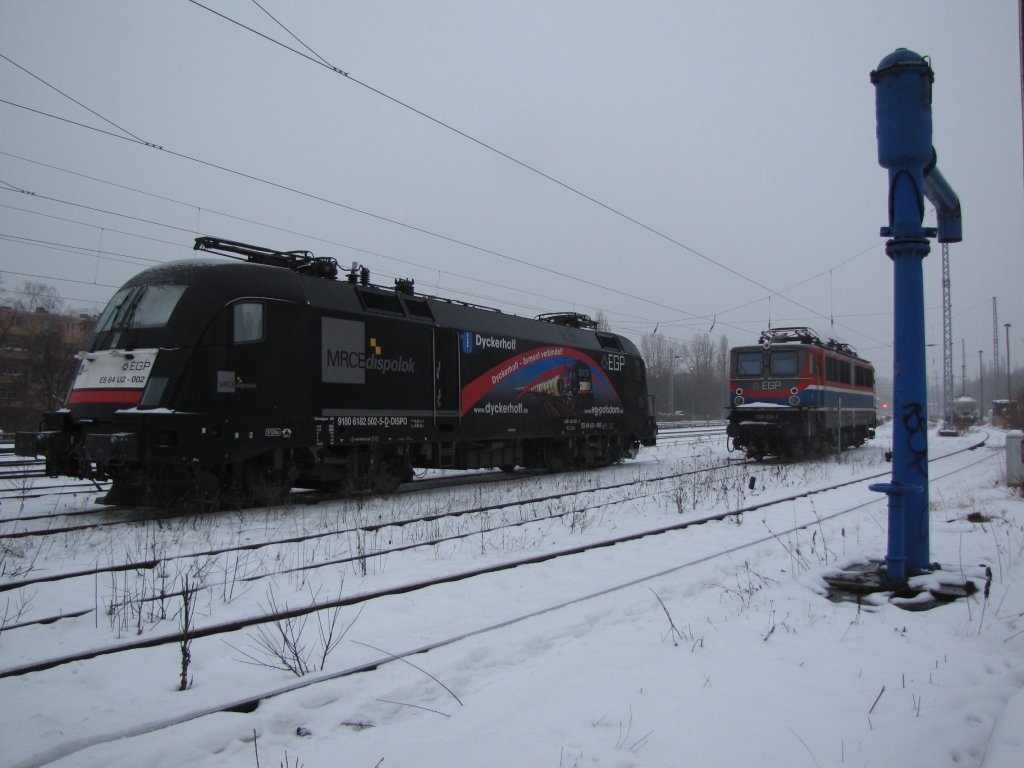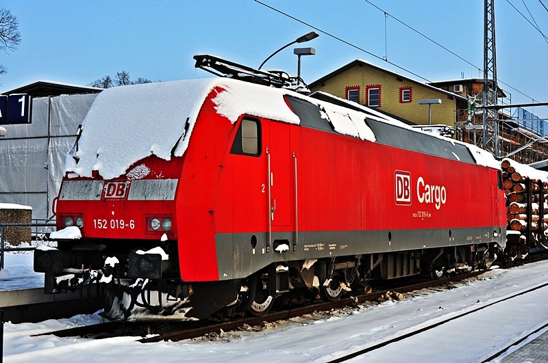 die mit der Hutkrempe voller Schnee, 152 019 mit ihrem Holzzug im Bf Greifswald abgestellt am 12.01.2010 weil weder in Richtung Pasewalk noch in Richtung Stralsund was ging - gut gehende Schneeverwehungen