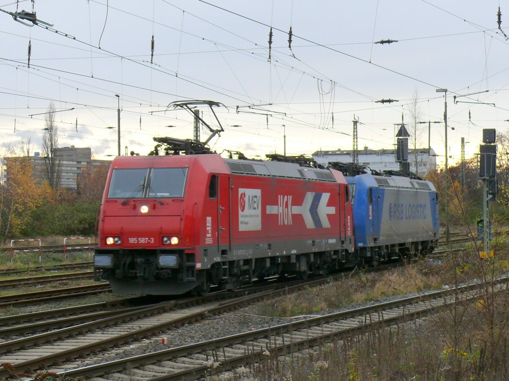 HGK 185 587-3 mit HGK (RSB Logistik) 185 526-1 im Schlepp, Ausfahrt Krefeld Hbf. nach Köln Deutzerfeld.(29.11.2009)