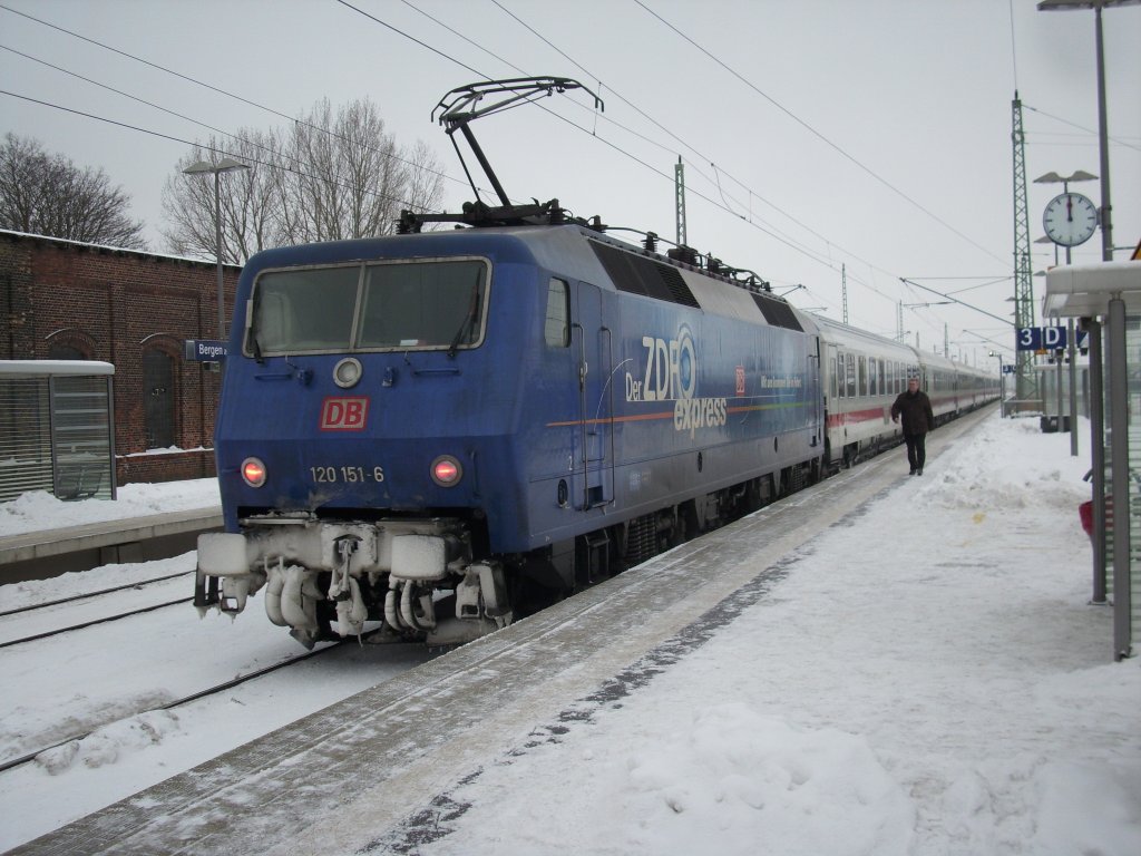 ZDF 120 151 schob am 18.Januar 2010 den IC 2377 Binz-Frankfurt/Main aus den Bahnhof von Bergen/Rügen.