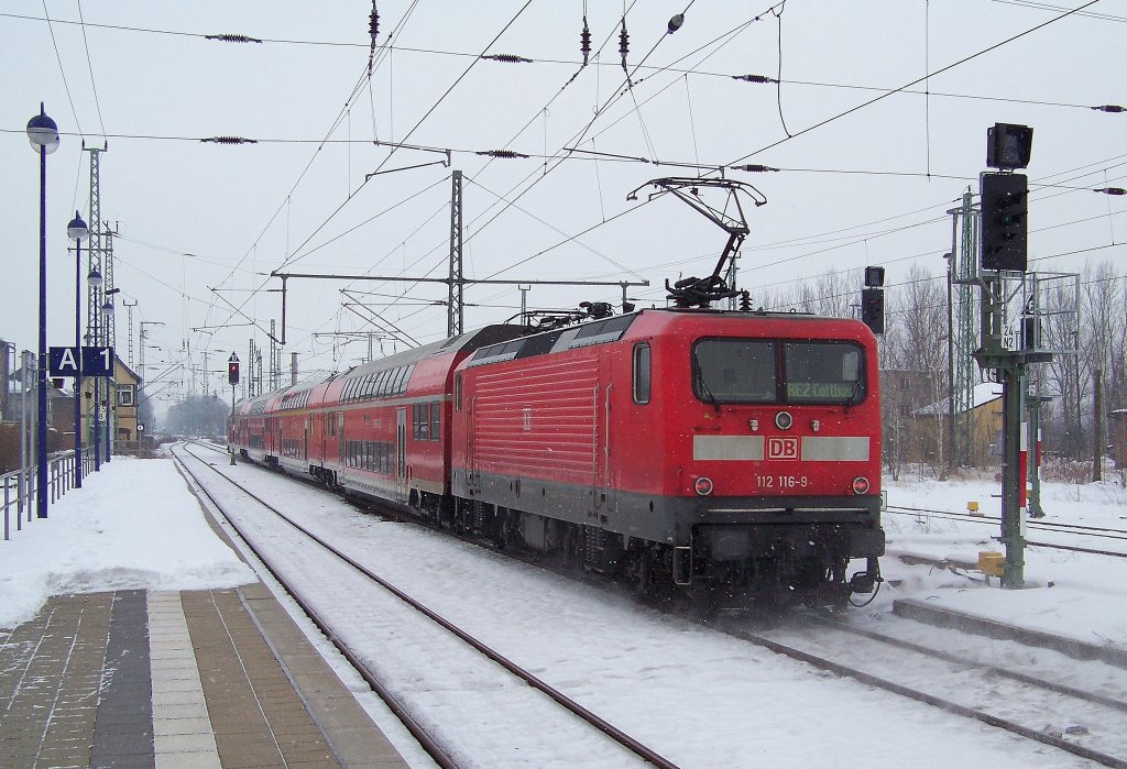 112 116-9 bei der Ausfahrt aus dem Bahnhof von Lübbenau/Spreewald. Er kam mit dem RE2 von Berlin Gesundbrunnen und fährt weiter nach Cottbus. 23.01.2010