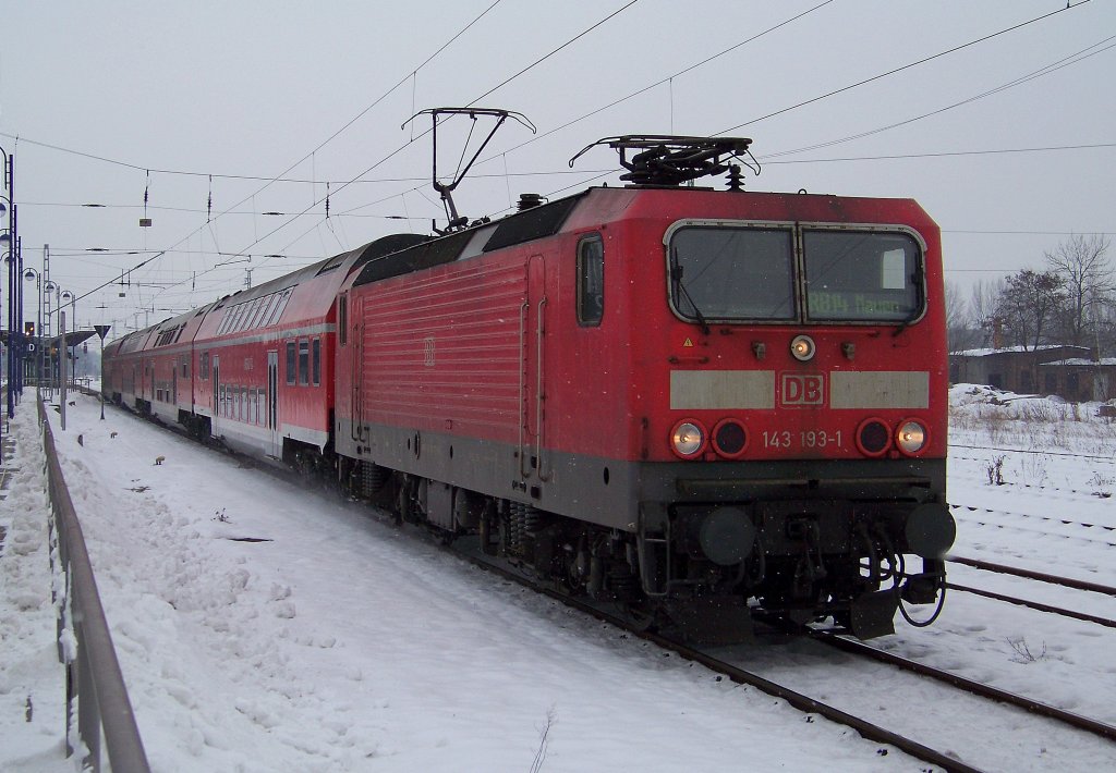 143 193-1 kommt hier mit einer RB14 von Calau/Niederlausitz nach Berlin Karlshorst über Berlin Schönefeld Flughafen aus dem Lübbenauer Bahnhof gefahren. 23.01.2010