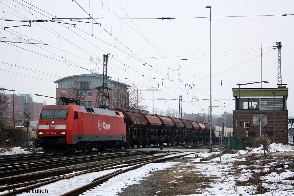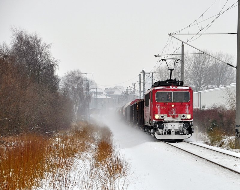 155 091 hat mit einem eisigen Gesichtsausdruck den Bf Stralsund verlassen und macht sich auf den Weg nach Rostock, 20.01.2010