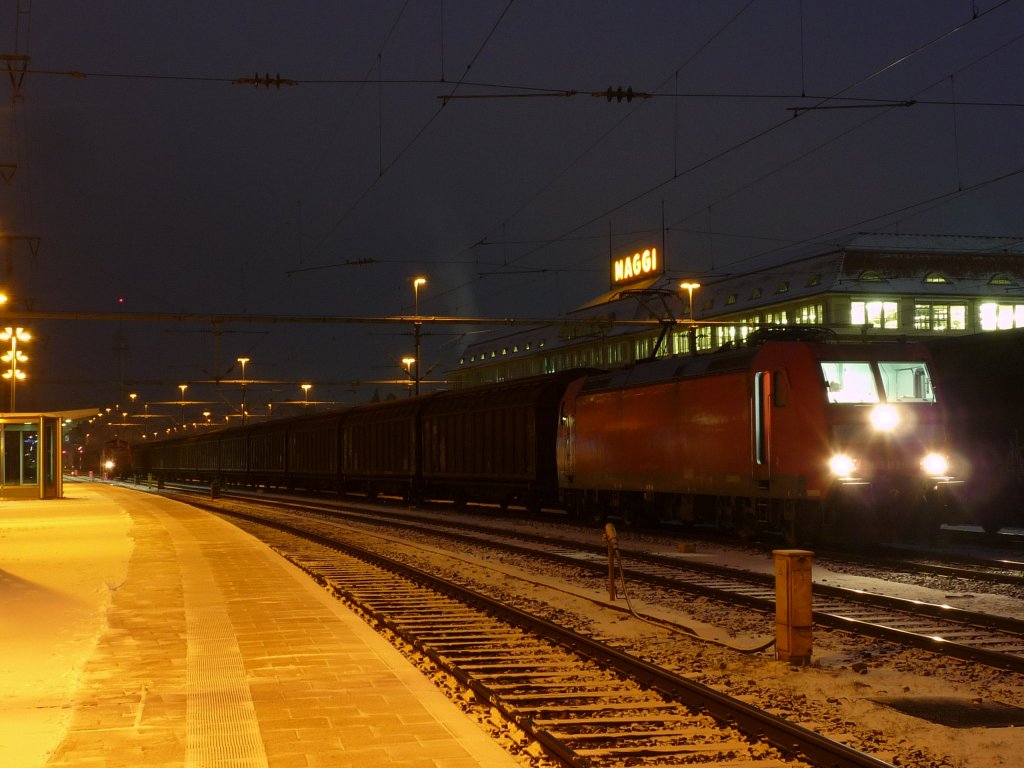 185 153-4 steht mit CFN 46334 (Bludenz/A-) Konstanz - Bremerhaven-Kaiserhafen in Singen(Htw). 20.01.10
