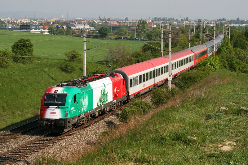 27.4.08 Am Tag der EM Lokparade in Wien Penzing fand die Rückfahrt der EM Italien Lok statt, natürlich ein Ereignis welches fast jeder Fotograf wahrgenommen hat. Hier fährt die 1216 004 mit dem IC 533 von Wien Südbahnhof nach Villach.