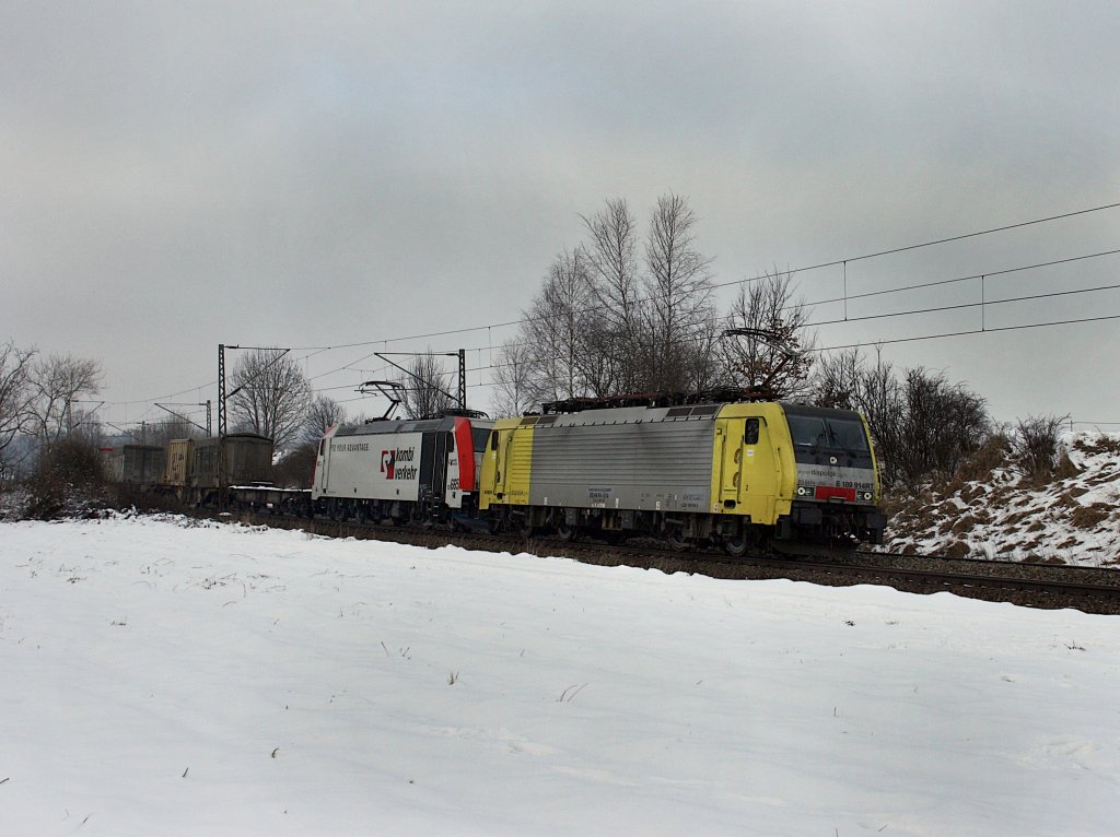 Dei ES 64 F4 014 und 185 665 mit einem KLV Zug am 16.01.2010 unterwegs bei Ostermünchen.