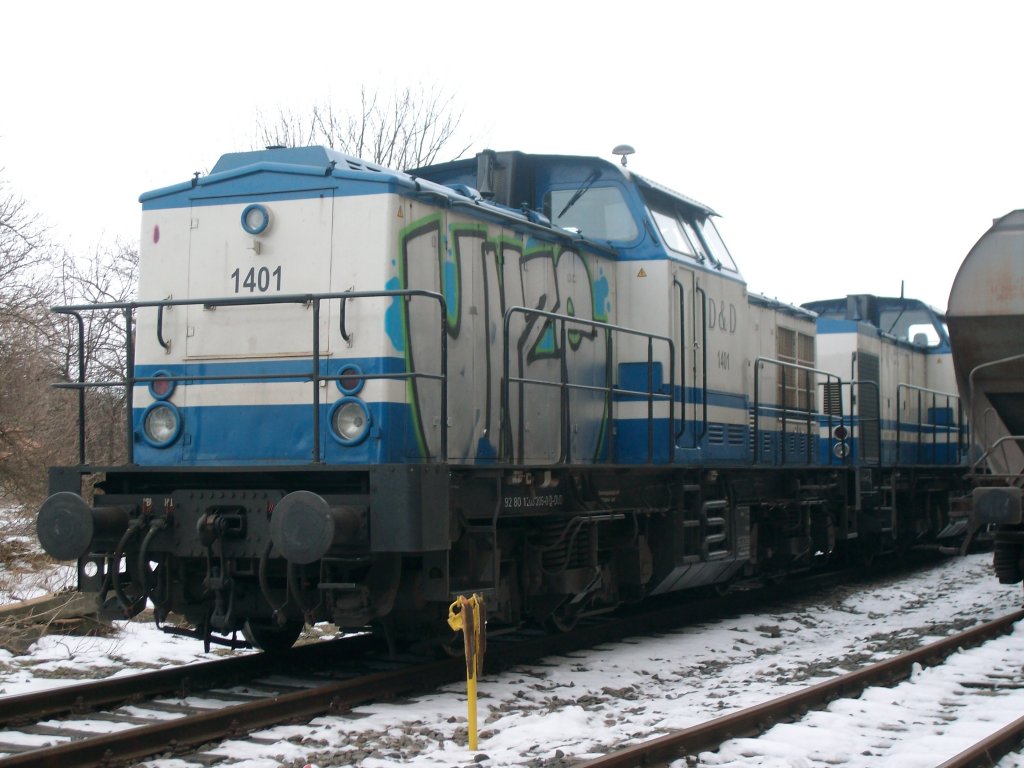 Die 1401 und 1702 der Firma D&D warten am 23.01.2010 in Bad Langensalza Ost auf die entladenen Getreidewagen.