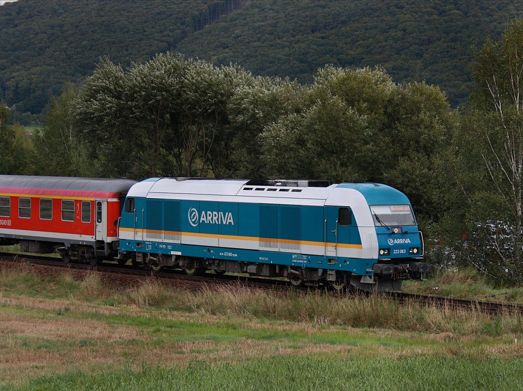 Die 223 063 am 05.09.2009 mit dem RE von Prag nach Nürnberg bei der einfahrt in Furt im Wald.