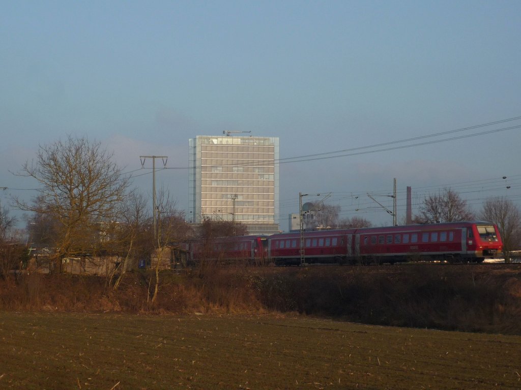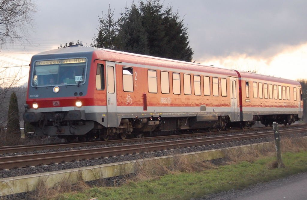 Ein 628er auf dem Weg nach Düsseldorf auf der Erftbahn kurz vorm Ortseingang von Kapellen/Erft am 20.1.2010 gegen 16.15Uhr abgelichtet.