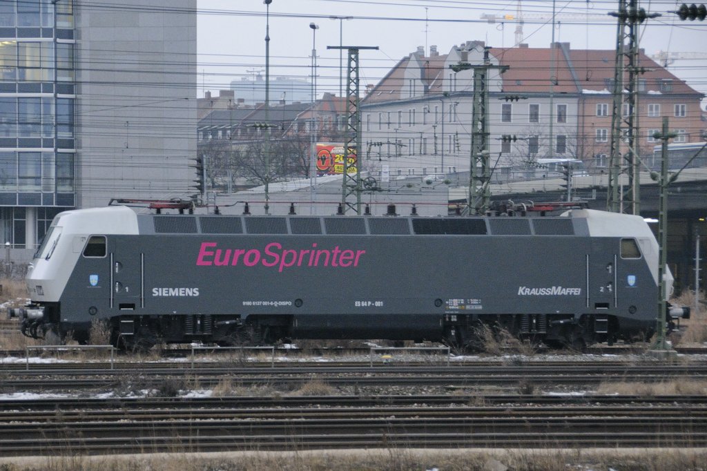 Lokportrait von ES 64 P-001 (ex 127 001-6) im Vorfeld des Münchner Hbf nähe Donnersbergerbrücke. Sie trägt in der Zwischenzeit das dritte Farbkleid. Als sie vor Jahren auf die Schiene kam, wußte keiner um ihren Zukunfts-Erfolg für eine ganze Lokomotivfamilie. Sie ist die Urmutter der Eurosprinter-Generation: ES (Eurosprinter) 64 (6,4 Megawatt) P (Prototyp) - 001. (23.01.2010).