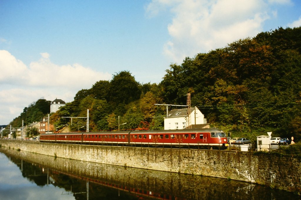 Mit dem Nahverkehrstriebwagen des Ruhrgebiets, dem ET 30, sind auf der Fahrzeugschau zum 150jährigem Jubiläum der deutschen Eisenbahn vom 3. - 13. Oktober 1985 in Bochum-Dahlhausen Rund- und Pendelfahrten durchgeführt worden. Hier ist er vierteilig in der Ausfahrt des Bahnhofs Bochum-Dahlhausen in Richtung Hattigen zu sehen.