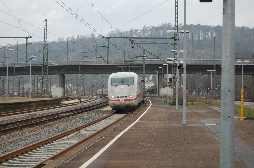 Vom harten Arbeitseinsatz geprägt fährt der auf den Namen "Plattling" getaufte ICE 1 durch Plochingen. Die Aufnahme entstand am 24.12.2009.