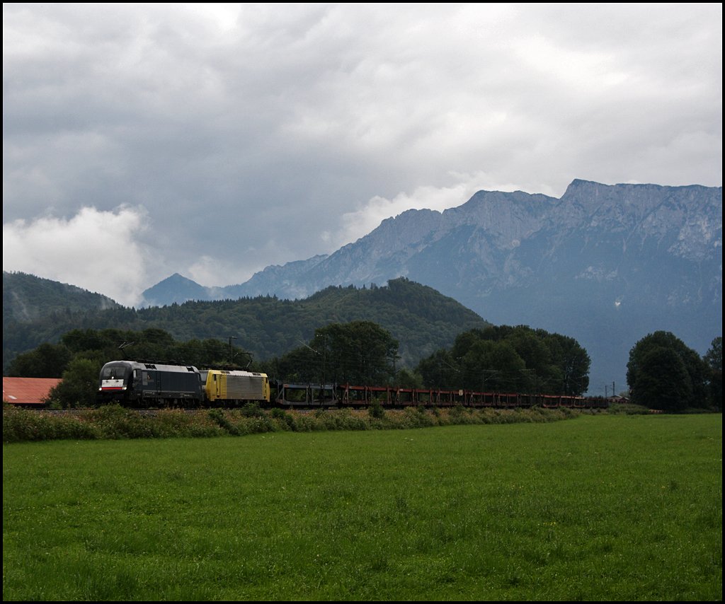 Schwarz-gelbe-Teamarbeit: Eine ES64U2 und eine E189er sind von Lokomotion mit dem leeren Autozug nach München unterwges. (10.08.2009)