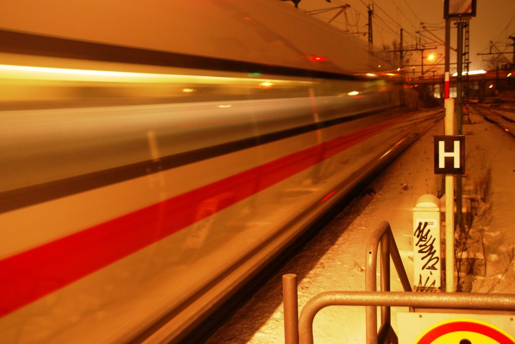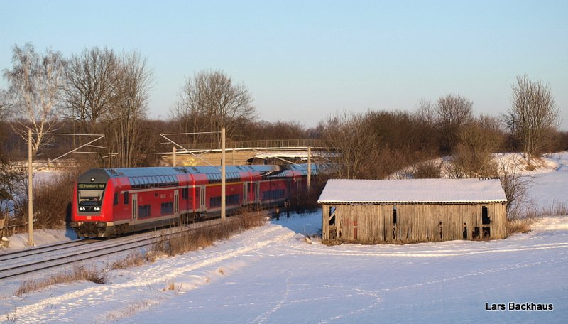 Bei tiefstehender, winterlicher Nachmittagssonne des 27.01.10 fährt ICE 36 von Kopenhagen nach Hamburg Hbf durch das beschauliche Dörfchen Altenfelde kurz vor Reinfeld (Holst.). Rechts daneben steht ein brachliegender Unterstand.