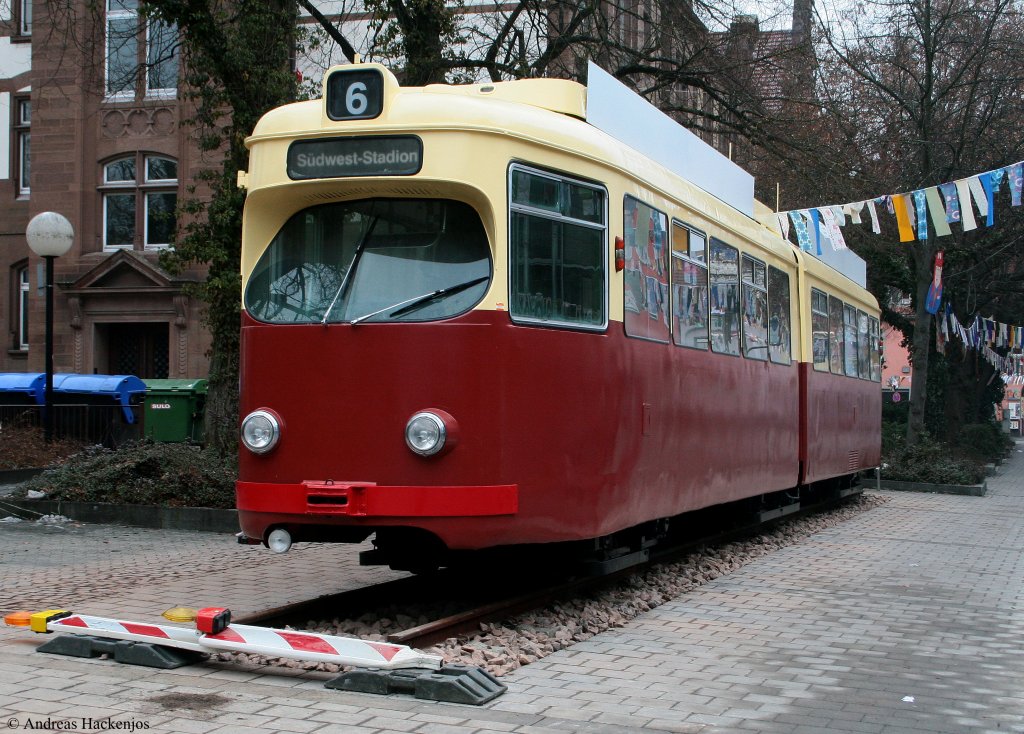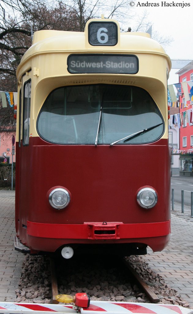 Die neue "Essbahn" in Singen. Es handelt sich um den ex. Ludwigshafener Tw 129, der in Singen als Imbiss erhalten bleibt 24.1.10. Leider wurde er 2 Tage später schon mit Graffiti besprüht :-(