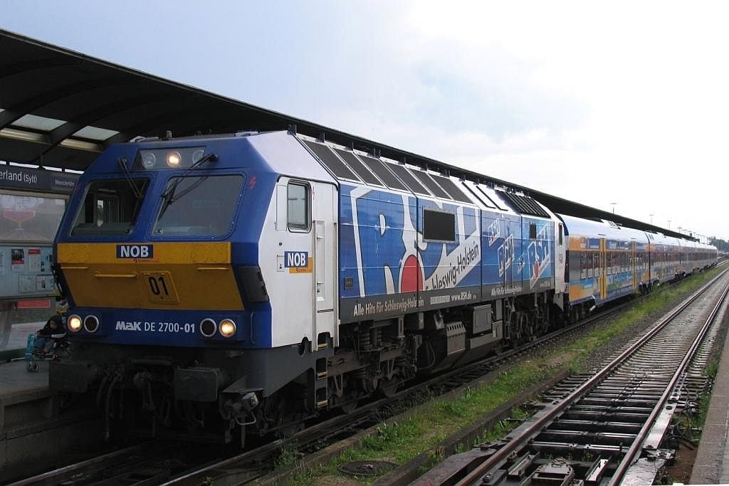 MAK DE 2700-01 der Nord-Ostsee-Bahn (NOB) mit NOB 80504 Hamburg Altona-Westerland (Sylt) auf Bahnhof Westerland (Sylt) am 23-6-2007.